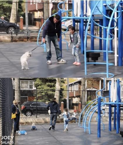 Eskperimen pun dilakoni pria yang sudah populer sebagai prankster (pembuat video lelucon atau eksperimen sosial) itu. Dengan membawa seekor anjing, dia mendekati seorang anak yang sedang bermain. Tanpa basa-basi memperkenalkan diri atau menyebutkan namanya, dia langsung menyapa anak perempuan tersebut. "Lihat anak anjing ini," katanya. Dan anak perempuan yang tampak menyukai anjing itu terlihat antusias melihat anjing putih lucu yang dibawa Joey.