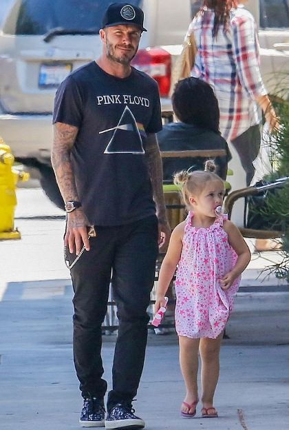 Harper tampak memakai empeng di mulutnya saat berjalan-jalan di kawasan West Hollywood bersama David Beckham, Jumat (7/8/2015). Mengenakan dress pink dan sandal jepit, anak bungsu David dan Victoria itu tampak santai saat berjalan bersama sang ayah.