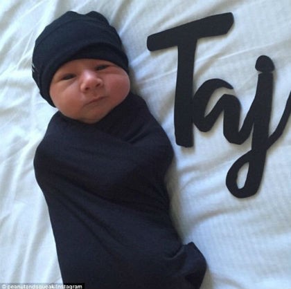 Foto Taj diunggah Ashy ke Instagram pada 6 Oktober 2015. Pada penampilan pertamanya di media sosial, bayi laki-laki itu tampak didandani ibunya dengan bedong hitam yang senada dengan topi dan hiasan tulisan namanya ‘Taj’.