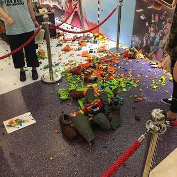 Lego senilai Rp 200 juta yang besarnya hampir seukuran manusia ini hancur berkeping-keping dalam sekejap. Padahal seorang seniman baru saja selesai merakit Lego tersebut. Yang menghancurkannya adalah seorang anak kecil.