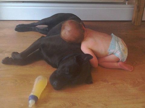 Si kecil Freyah tidak dapat menahan kantuknya saat sedang bermain di karpet. Beruntung dia ditemani anjing peliharaan labrador yang setia ada di dekatnya. Dan anak berusia satu tahun tidur dengan bersandar pada anjingnya.