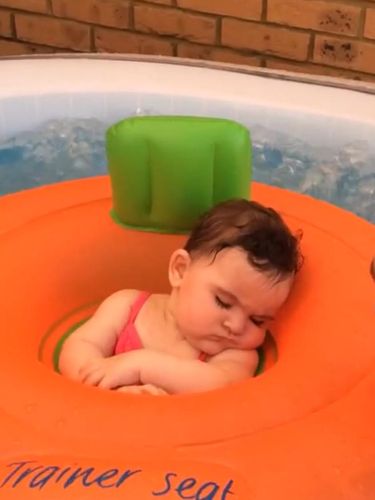 Berendam air hangat memang bisa membuat relaks dan mengantuk. Inilah yang terjadi pada anak kecil di foto berikut. Dia tertidur saat berendam di kolam air hangat. (eny/asf)