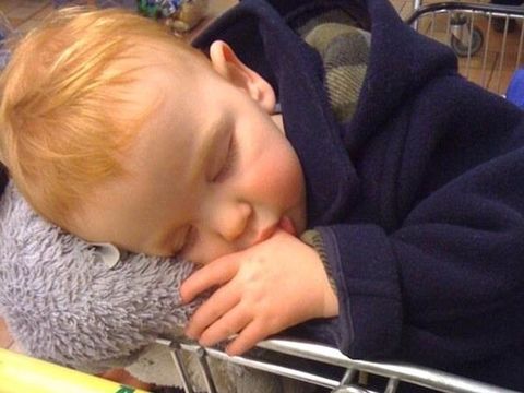 Menemani mama belanja, sepertinya bukanlah kegiatan favorit anak ini. George Eliison yang berusia 17 bulan, seperti diceritakan oleh mamanya, tertidur di dalam troli sambil memeluk boneka kesayangannya.