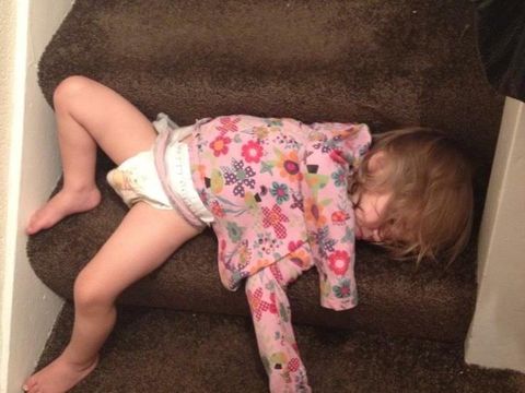 Anak kecil ini tertidur di saat dia menuju ke kamarnya yang berada di lantai dua. Dia sudah tidak mampu lagi menahan kantuknya dan memilih meletakkan badannya di tangga.