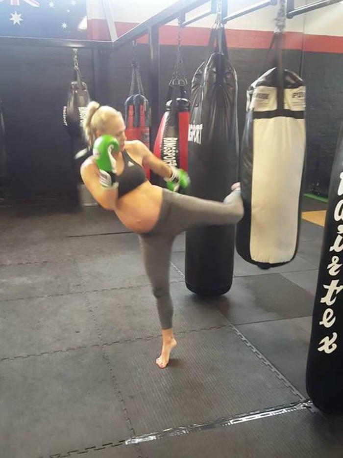 Seperti yang Caley perlihatkan melalui sejumlah video di Facebook dan Instagram miliknya. Meski kandungannya berusia 39 minggu (hampir 10 bulan), wanita asal Australia ini tetap giat berlatih Muaythai.