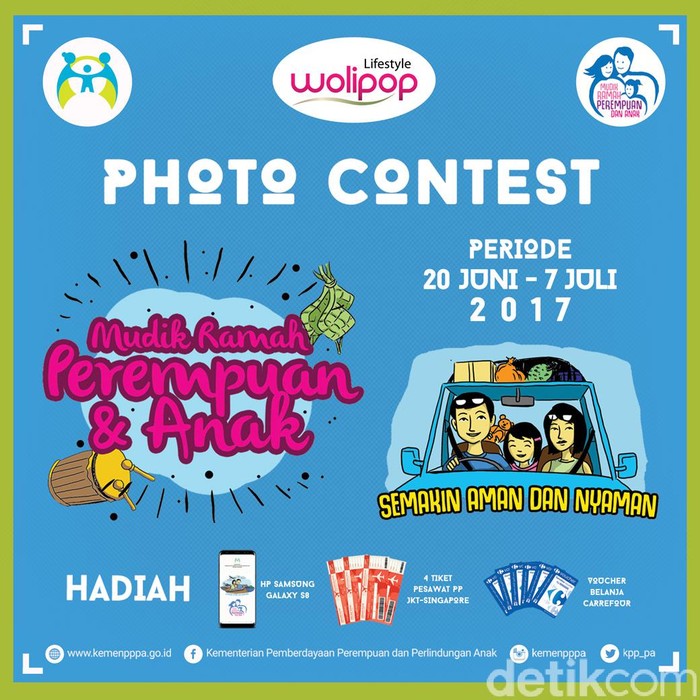 Kementerian Negara Pemberdayaan Perempuan dan Perlindungan Anak RI bekerjasama dengan Detikcom mengadakan kontes foto 'Mudik Ramah Perempuan dan Anak'. Kontes foto mudik ini berhadiah menarik yaitu empat tiket PP ke Singapura, 1 handphone Samsung Galaxy S8 dan voucher belanja Carefour.