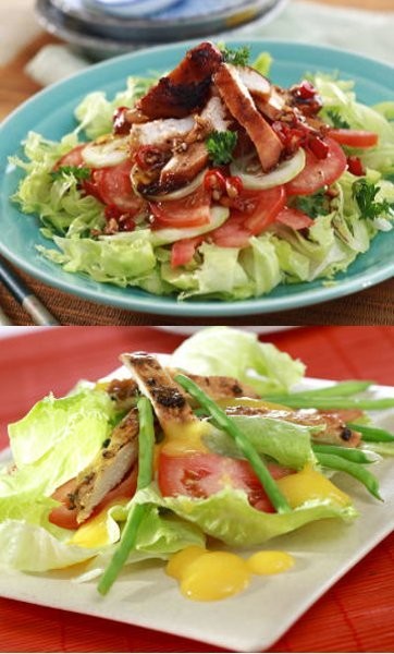 Susun bahan salad di atas piring saji. Beri irisan ayam.