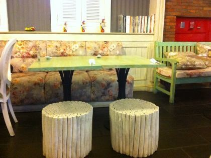 Dinding bata merah yang tak dilapis semen mengentalkan nuansa Country. Sementara sofa, kursi dan bantal hias motif floral memberi kesan feminin dan vintage. Warn interior didominasi palet lembut dan cokelat. Salah satu dekorasi yang cukup unik adalah lampu chandelier yang terbuat dari puluhan sendok stainless steel yang disusun sedemikian rupa.