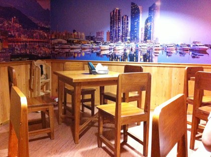 Jika lebih suka makan menghadap pemandangan luar, bisa memilih duduk di bagian depan. Telah tertata kursi dan meja kayu dengan aksen rumput berwarna hijau yang memberi sedikit efek segar pada ruangan yang didominasi warna cokelat kayu ini. Untuk menu makanan, tentu saja yang disajikan adalah kuliner khas Korea yang sudah cukup populer di Indonesia, karena terbilang sering dimunculkan dalam adegan-degan drama Korea.