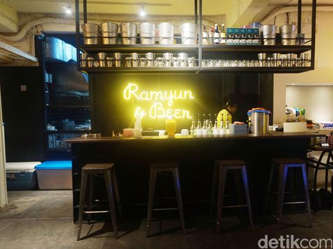 Beberapa mural bergambar ramyun menghiasi dinding kontainer, menghadirkan ambiens yang lebih muda dan santai. Kursi dan meja pun terlihat simpel, terbuat dari kayu tanpa hiasan maupun ornamen rumit. Sementara di bagian meja bar, terpampang tulisan 'Ramyun & Beer' dari lampu neon kekuningan.
