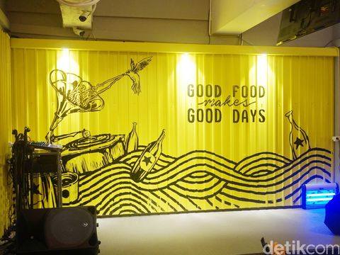 Terlihat dari bohlam-bohlam yang dipasang bergelantungan dan masih terlihat untaian kabelnya, lantai semen tanpa keramik, langit-langit dengan pengecatan yang terkesan unfinished, dan yang paling menonjol dari gaya industrial ini adalah pemanfaatan kontainer bekas pada beberapa bagian dindingnya. Palet putih mendominasi ruangan resto yang juga banyak menggunakan elemen kaca sebagai pencahayaan alami, yang 'disegarkan' dengan percikan warna kuning cerah.