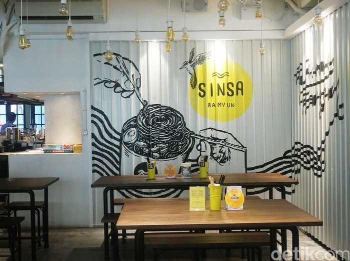 Sinsa Ramyun menghadirkan ramyun, mie khas Korea sebagai menu andalannya. Saat mengunjungi cabang restonya di Kemang, nuansa modern minimalis tampak dominan dalam penataan interior. Mengikuti tren interior yang menjadi favorit saat ini, Sinsa Ramyun juga mengadaptasi konsep industrial.