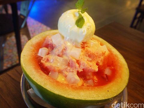 Saat pesanan datang, kami dibuat agak terkejut karena porsinya yang lumayan besar. Satu porsi mungkin cukup untuk dia sampai tiga orang. Es serut khas Korea ini disajikan menggunakan buah semangka asli sebagai pengganti wadah atau mangkok. Es serutnya yang berwarna merah pun 'menjulang' dan diberi satu scoop es krim vanilla di atasnya, serta taburan jelly rasa buah. Tekstur es sangat lembut dan langsung lumer di mulut. Dimakan bersama es krim, rasanya jadi terasa lebih lezat dan segar.