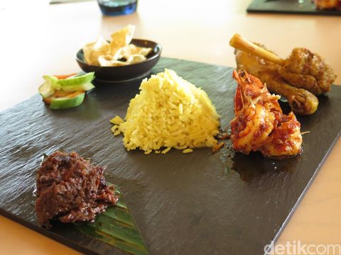Bila ingin mengonsumsi makanan yang lebih berat bisa memesan Rasa Nusantara Platter. Menu ini berisi nasi kuning, udang cabai, ayam, dan rendang. Porsinya cocok untuk makan siang. Penyajian makanannya terlihat unik menarik untuk diunggah ke jejaring sosial.
