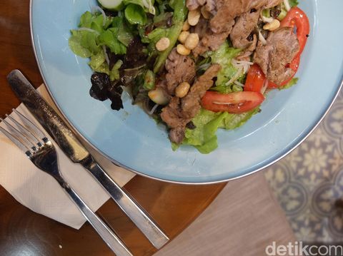 Merasa belum afdal tanpa daging-dagingan? Kalau ya, jangan lewatkan menu Thai Beef Salad. Menu yang satu ini terbuat dari sayuran, sohun, tauge, timun, dan daging sapi panggang cincang dengan siraman saus Thai yang terasa asam-manis. Tidak lupa, taburan kacang tanah yang memberikan sensasi crunchy di lidah.