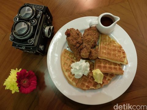 Kami juga mencicip hidangan unggulannya, Buttermilk Fried Chicken dengan olesan butter, krim dan maple syrup. Disajikan bersama dua pilihan hidangan pendamping, pancake atau waffle. Perpaduan gurih-asin dan manis menghasilkan citarasa lezat sekaligus unik. Anda perlu menambahkan maple syrup ke atas waffle atau ayam untuk mendapatkan kelezatan unik dari menu yang satu ini.