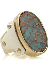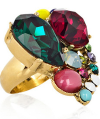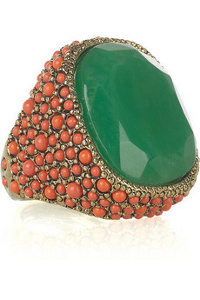Cincin oversized dengan warna yang mencolok memang mampu menarik perhatian orang. Kenneth Jay Lane mengembangkan cincin ini menjadi bentuk yang elegan. Penataan satu batu besar berwarna hijau dan bebatuan warna oranye yang menyebar mengikuti bentuk cincin tersebut membuatnya semakin mewah. Koleksi cincin ini juga dibalut emas 22 karat dan dibanderol seharga Rp 1,7 juta.