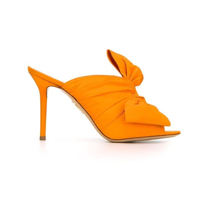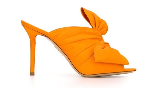 Bosan dengan desain high heels biasa? Coba cari yang modelnya mule seperti opsi dari Charlotte Olympia berikut. Yang membuatnya menarik adalah aksen ikat pita yang tersedia di bagian depan. Sepatu itu juga dihadirkan dengan warna oranye muda yang cerah sehingga lebih mencuri atensi ketika dikenkan. Dapatkan item ini dengan harga Rp 10 jutaan.