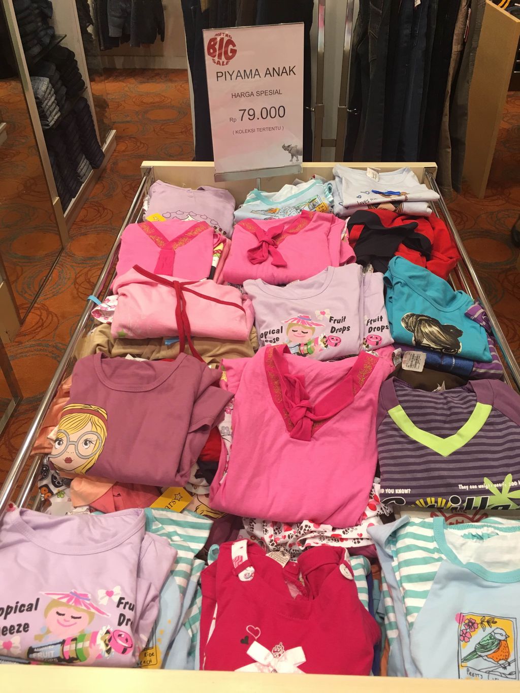 Anda pun dapat sekaligus membeli mainan untuk anak-anak. Koleksi boneka terbaru dari Kungfu Panda Series bisa menyediakan pakaian dalam untuk anak yang sekarang seharga Rp 24 ribuan hingga Rp 78 ribuan dari Rp 40 ribuan sampai Rp 129 ribuan. Lalu koleksi piyama ditawarkan dengan harga spesial Rp 80 ribuan. Kemudian serangkaian busana dari Hot Wheels turun menjadi Rp 79 ribuan dari harga normal Rp 189 ribuan sampai Rp 229 ribuan.