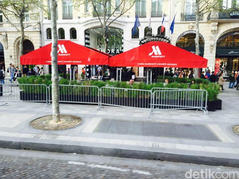 Champs Elysees terbentang dari Place de l'Etoile hingga Place de la Concorde. detikcom, manajemen dan mitra hijab merek Elzatta dan Dauky berkesempatan berada di sana pada Jumat (22/4/2016) siang waktu setempat di sela-sela pemotretan busana ready to wear Dauky.
