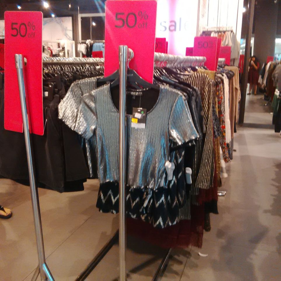 Topshop mendiskon sejumlah busana bernuansa metalik nan glamour. Terdapat crop top silver yang turun dari Rp 543 ribu menjadi Rp 300 ribu. Kaus abu warna cokelat metalik turun dari Rp 500 ribu dari Rp 300 ribu. Kaus lengan panjang hitam dengan benang emas turun dari Rp 670 ribu menjadi Rp 270 ribu. Lalu dress tanpa lengan emas diskon 50% menjadi Rp 320 ribu.