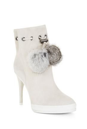 Booties atau ankle boot dengan heels juga ada yang dilengkapi dengan aksen pom pom. BCBG Maxazria pun menyediakan opsinya yang bermaterial suede dan berwarna putih. Pom pom bulu kelinci kali ini cukup menarik karena hadir serupa bandul. Item seharga Rp 1,8 jutaan tersebut pantas digunakan saat wisata ke luar negeri ketika cuaca sedang dingin.