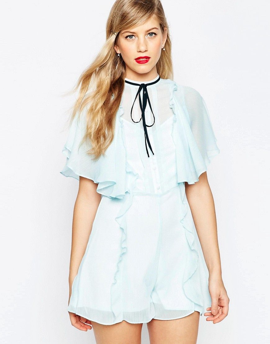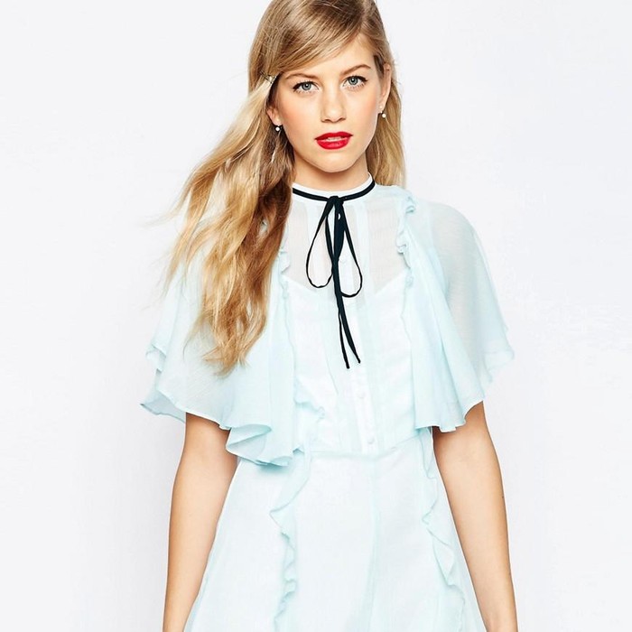 Ruffle juga hadir pada opsi selanjutnya. Kali ini detail tersebut diterapkan pada sebuah playsuit berwarna biru muda. Selain ruffle, tersedia pula aksen pita hitam yang semakin mempermanis penampilannya. Busana seharga Rp 866 ribuan itu cocok dikenakan bepergian dinamis terlebih adanya kehadiran cutout di bagian punggungnya yang membuat Anda tak mudah gerah.