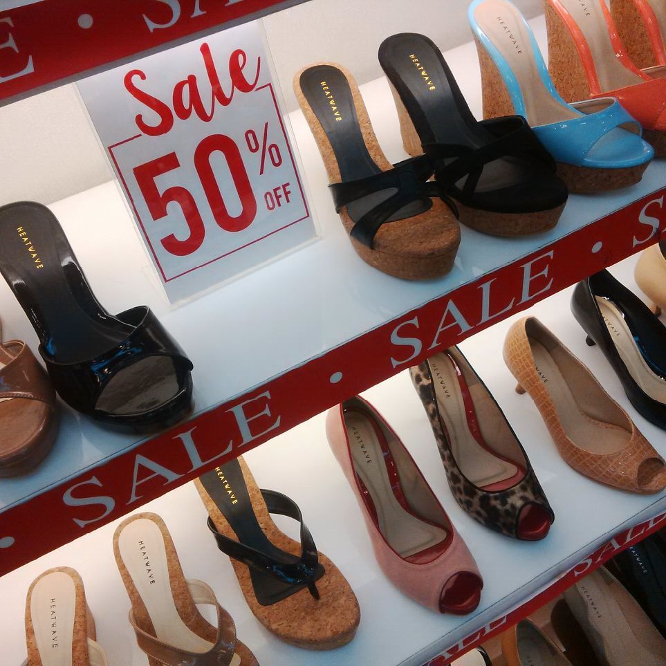 Adapun heels bermotif kulit ular bernuansa cokelat serta ungu yang turun dari Rp 480 ribu menjadi Rp 340 ribu. Heels pointy bercorak kulit macan dengan aksen merah di ujungnya turun dari Rp 400 ribu menjadi Rp 320 ribu. Ankle strap wedges warna pink dan cokelat turun dari Rp 500 ribu menjadi Rp 350 ribu. Begitu pula dengan wedges hitam, merah, dan biru.