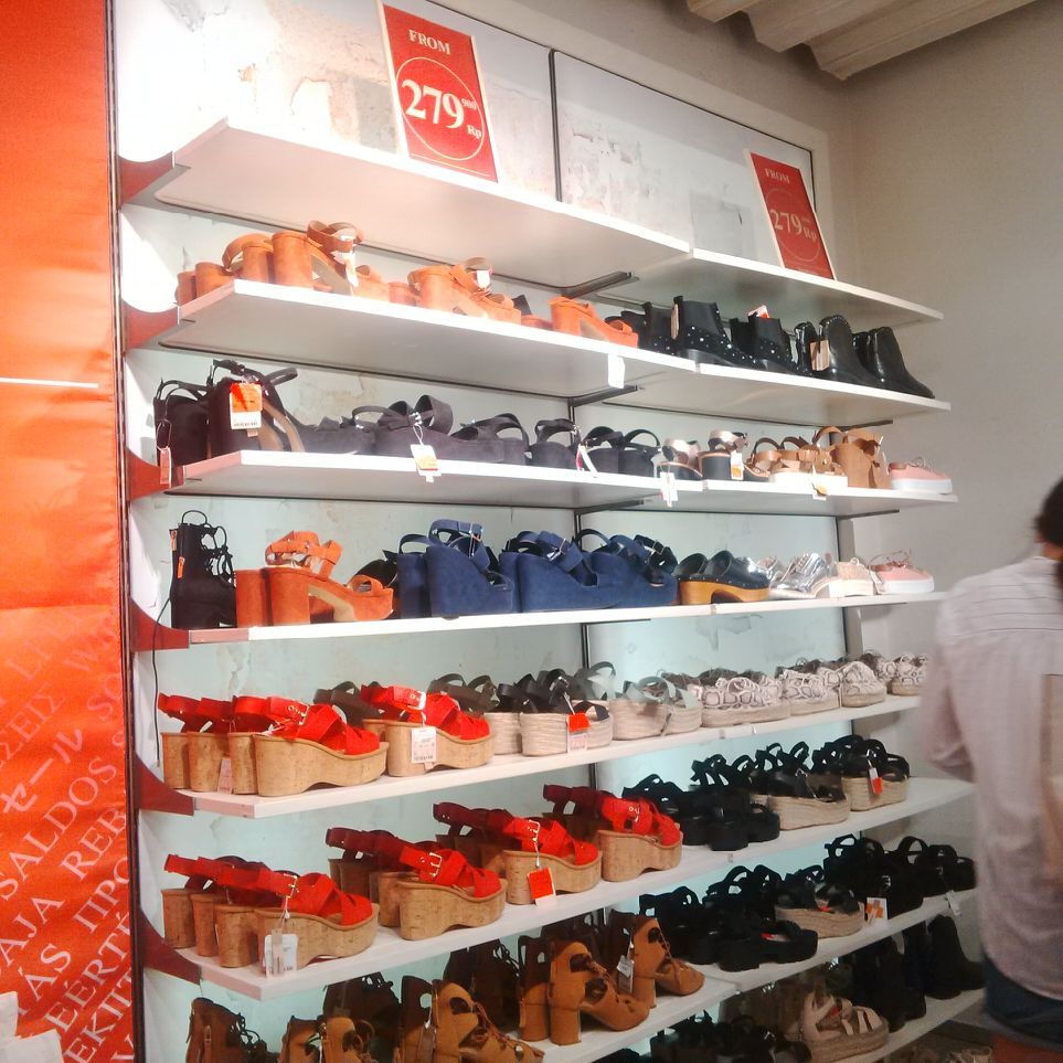 Kemudian ada sandal sepatu hitam dengan sol tebal yang turun menjadi Rp 550 ribu menjadi Rp 350 ribu. Begitu pula dengan strappy wedges warna biru navy. Lalu strappy heels suede warna cokelat khaki diskon 50% menjadi Rp 350 ribu.