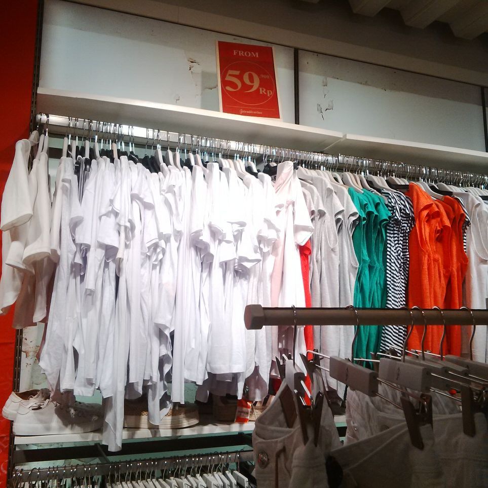 T-shirt putih minimalis seharga Rp 180 ribu menjadi Rp 59 ribu. T-shirt putih dengan berbagai tulisan atau motif seharga Rp 129 ribu menjadi Rp 59 ribu. Sedangkan jaket bomber warna hitam turun dari Rp 360 ribu menjadi Rp 200 ribu. Long cardigan putih turun dari Rp 200 ribu menjadi Rp 120 ribu. Sedangkan jaket biru berkerah abu-abu turun dari Rp 360 ribu menjadi Rp 300 ribu.