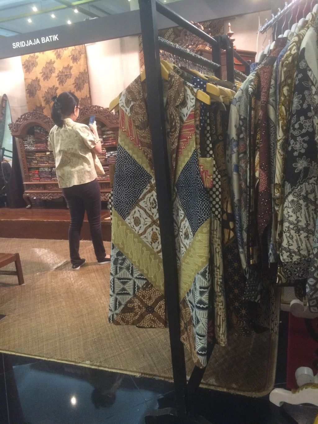Ingin cari baju batik yang stylish dan bisa dikenakan hangout? Kunjungi gerai Sridjaja Batik. Tenant itu menjual berbagai pakaian, salah satunya rangkaian outerwear menarik. Sebuah outerwear tanpa lengan dengan aksen cut out di bagian samping dijual Rp 2.750.000. Luaran kain dengan aksen ikat pinggang bisa dimiliki dengan Rp 2.250.000. Adapun setelan atasan-celana batik seharga Rp 1.900.000.