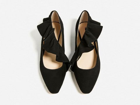 Sepatu warna hitam memang mudah dipadukan dengan berbagai busana dan kesempatan. Jika Anda ingin terlihat stylish meski hanya memakai flats, coba pertimbangkan item berikut ini. Meski dihadirkan dengan desain yang sederhana, alas kaki itu punya detail unik yang membuat spesial dan feminin. Yakni aksen frill atau rumbai menyilang di bagian atasnya. Padukan Frill Detail Ballerinas seharga Rp 560 ribu tersebut dengan dress kaya warna.
