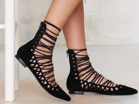 Desainer ini dikenal akan rancangan sepatu yang menarik namun harganya cukup terjangkau. Seperti strappy flats berikut yang dapat menjadikan penampilan Anda mencuri atensi. Meski terlihat penuh tali, Jeffrey Campbell Ariane Lace-Up Suede Flats akan mudah diaplikasi karena dilengkapi resleting di bagian belakang. Item seharga Rp 630 ribuan itu cocok dipadukan dengan busana vintage.