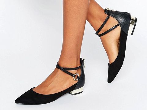 Situs belanja ASOS menyediakan flats hitam stylish yang juga elegan dan feminin. Tampil dengan ujung lancip sehingga membuat kaki terlihat lebih indah, sepatu itu juga dilengkapi aksen mutiara. Adapun potongan V di bagian depannya yang dapat membantu kaki terlihat lebih kecil. Miliki item tersebut seharga Rp 394 ribuan.