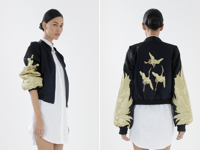 Duo desainer Malaysia-Indonesia, Sean & Sheila juga menyuguhkan jaket Bomber ala Jokowi yang tak kalah menarik. Tampil dengan desain yang sederhana, tersedia detail sulaman nan menawan. Sulaman warna emas berupa sayap burung di bagian lengan dan burung di bagian belakang tersebut bisa menjadikan Anda lebih mencuri perhatian. Jaket dengan lengan menggembung itu bisa dimiliki seharga Rp 5,9 juta.