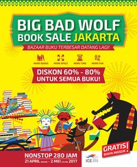 Belum sempat ke pameran buku paling hits ini? Anda masih bisa menengoknya karena The Big Bad Wolf masih digelar di ICE BSD City, Tangerang, hingga 2 Mei 2017. Pengunjung bisa datang kapan saja karena pameran yang menawarkan berbagai buku impor maupun lokal dengan harga miring ini buka selama 24 jam non-stop. Menempati empat hall di area ICE BSD City, The Big Bad Wolf menghadirkan tak kurang dari 5 juta buku berkualitas dengan pilihan genre yang beragam mulai dari dewasa hingga untuk anak-anak. Menariknya lagi, semua buku ditawarkan dengan potongan harga 60 - 80 persen. Selain Indonesia, The Big Bad Wolf telah diselenggarakan di berbagai negara Asia Tenggara, dengan misi untuk menciptakan