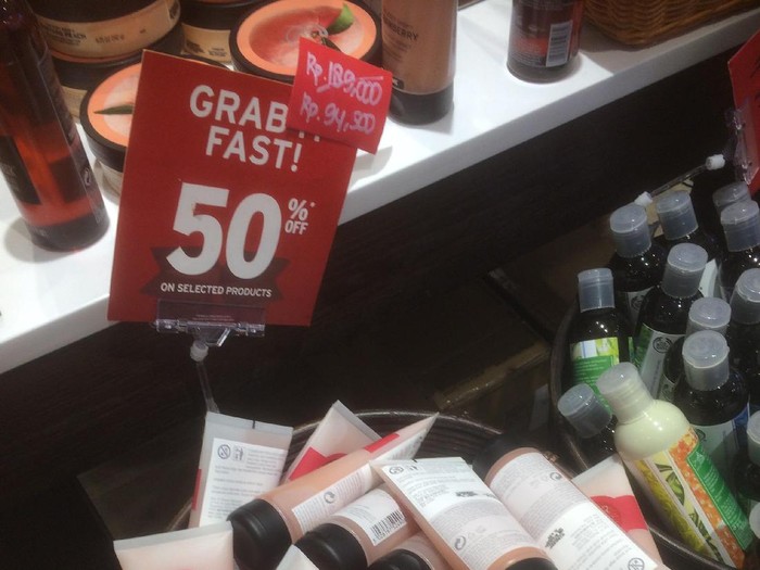Anda yang menyukai dunia kecantikan mungkin menggemari brand The Body Shop. Jika begitu, merek perawatan kulit dan makeup tersebut pun patut Anda kunjungi dalam waktu dekat. Pasalnya, The Body Shop tengah menggelar diskon besar-besaran. Di Kota Kasablanka, potongan harga hingga 50% diberikan pada sejumlah produk, mulai dari lipstik, body scrub, hingga parfum.