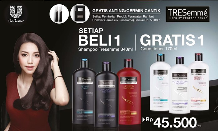 Dapatkan gratis anting atau cermin cantik untuk setiap pembelian produk perawatan rambut Unilever (termasuk Tresemme) senilai Rp 50.000. Dapatkan juga promo gratis kondisioner 170 ml untuk setiap pembelian sampo Tresemme 340 ml seharga Rp 45.500/botol.