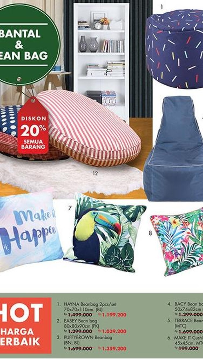 Masih ada Tropica Cushion with filling 45x45 cm MTC juga dengan harga diskon RP 179.100/pc dari harga normal Rp 199 ribu/pc. Selain itu ada Hilon Floor Cushion 70x100 cm dengan harga istimewa Rp 249 ribu/pc dari harga normal Rp 468 ribu/pc.