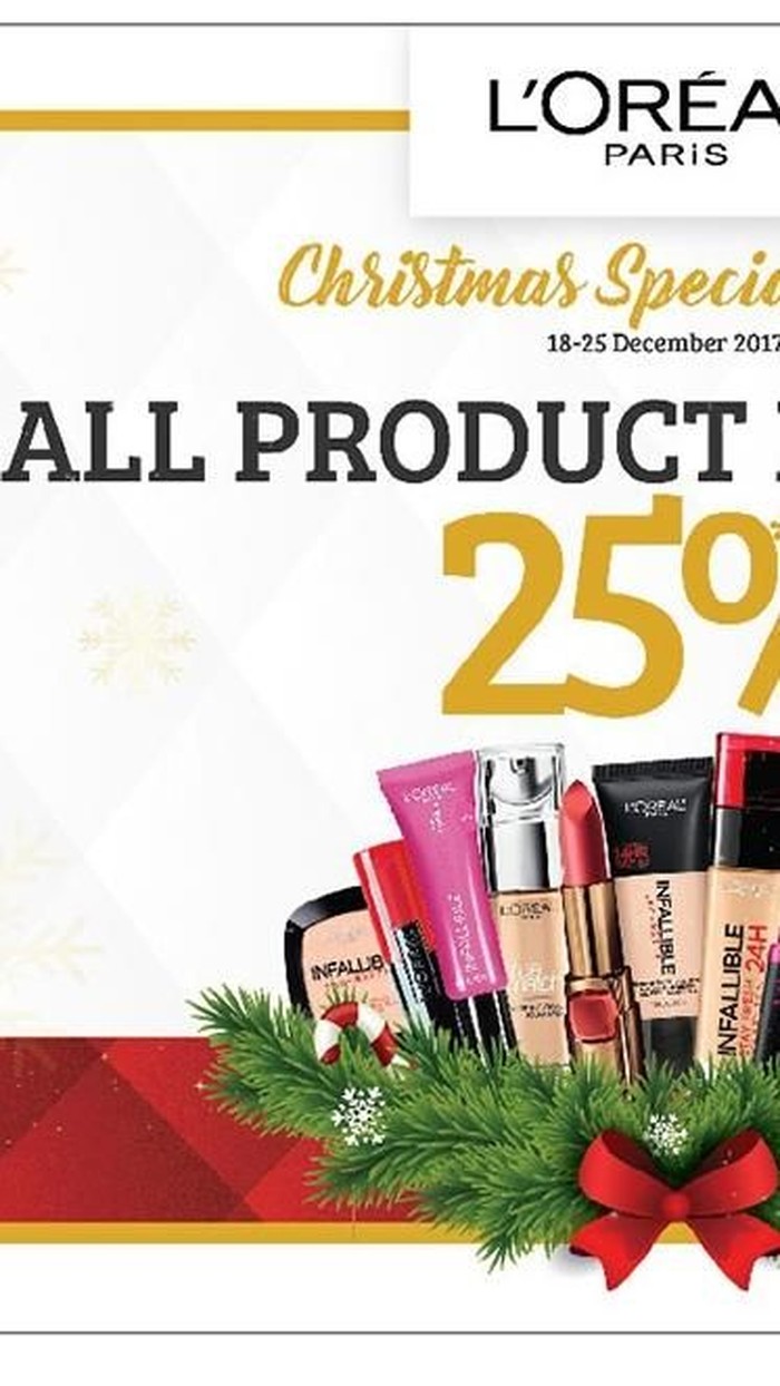 "Tak ketinggalan diskon 25% juga diberikan oleh L'oreal Paris untuk semua produk berlaku mulai dari tanggal 18-25 Desember 2017," ujar Corporate Communication General Manager PT Trans Retail Indonesia Satria Hamid, Minggu (3/12/2017).