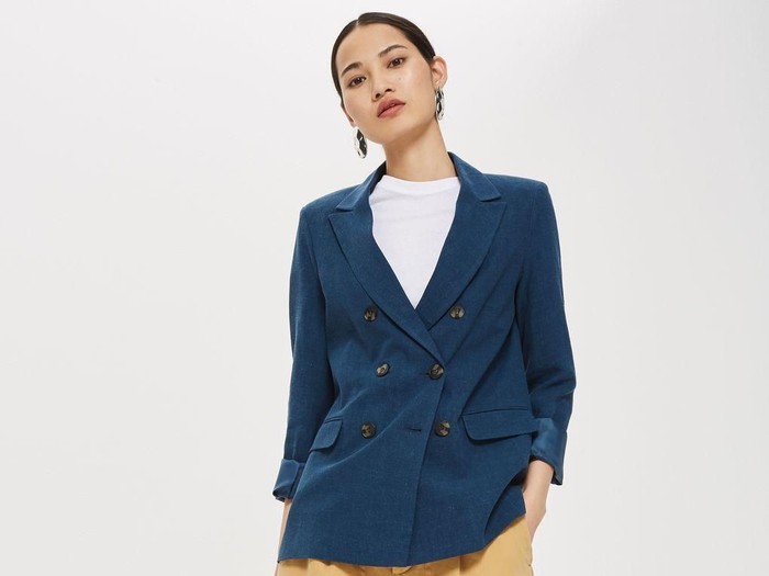 Retailer asal Inggris cukup banyak menawarkan opsi blazer yang berkesan formal tapi tetap stylish. Salah satunya Double Breasted Linen Blazer yang hadir dengan tiga opsi warna berikut. Opsinya yang berwarna biru tua seharga Rp 1,3 jutaan ini patut dipilih karena mudah dipadukan dengan busana berbagai palet di keseharian. Seperti gambar, Anda bisa menggabungkannya dengan celana kuning untuk terlihat segar dan mencuri atensi.