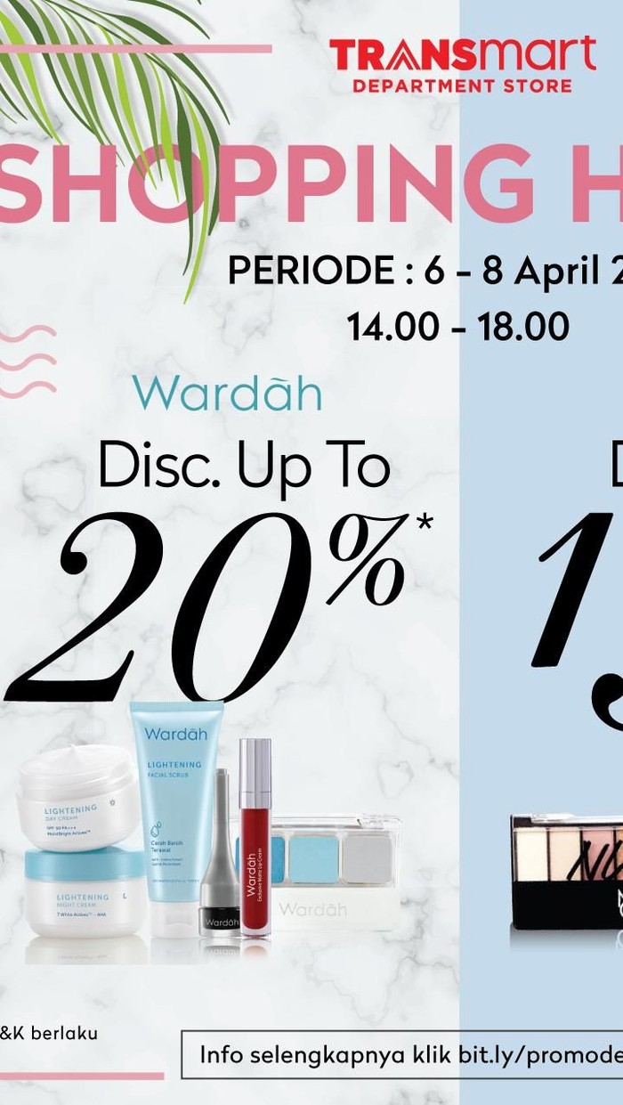 "Saat ini Transmart Department Store mengadakan pesta diskon khusus untuk produk-produk kosmetik tertentu dari Wardah dan Make Over, berlaku mulai periode 6-8 April 2018," ujar Corporate Communication General Manager PT Trans Retail Indonesia, Satria Hamid, Minggu (8/4/2018).