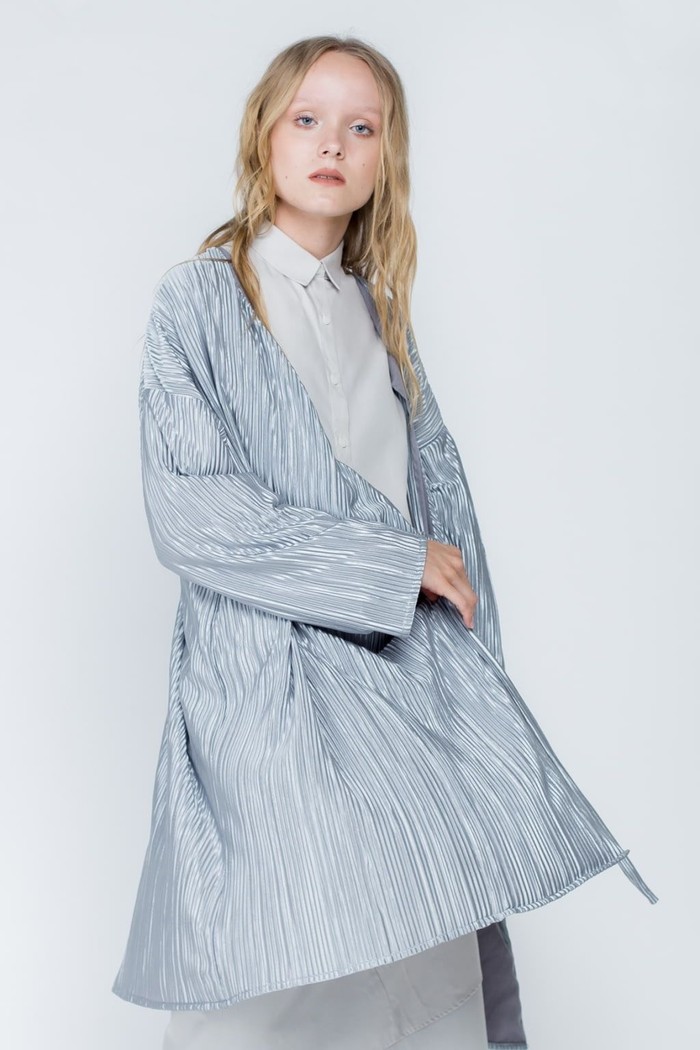 Brand lokal berikut ini menawarkan outerwear dengan warna biru muda yang manis. Silver Algae Long Cardigan berikut juga terlihat atraktif berkat material lipitnya. Kardigan seharga Rp 369 ribuan tersebut pun lebih panjang dan tertutup sehingga cocok dipadukan untuk busana hijab.