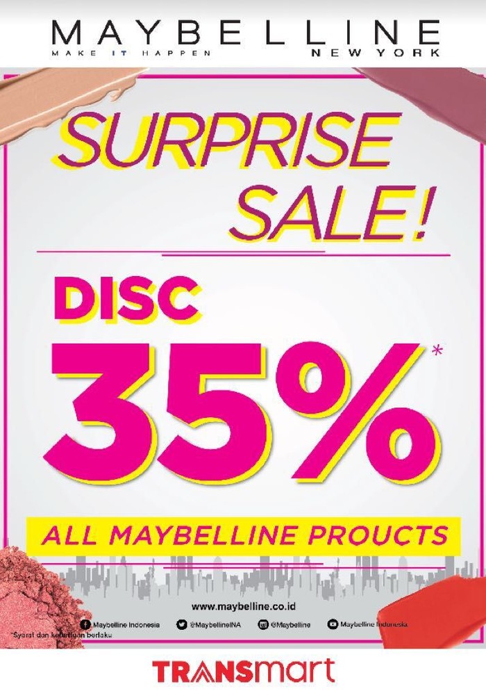 Kapan lagi bisa dapat aneka peralatan kecantikan dengan harga miring? Hanya untuk hari ini, Anda bisa mendapat diskon 35% untuk produk Maybelline khusus di Transmart Department Store supaya di hari Lebaran nanti bisa tampil cantik dan spesial.