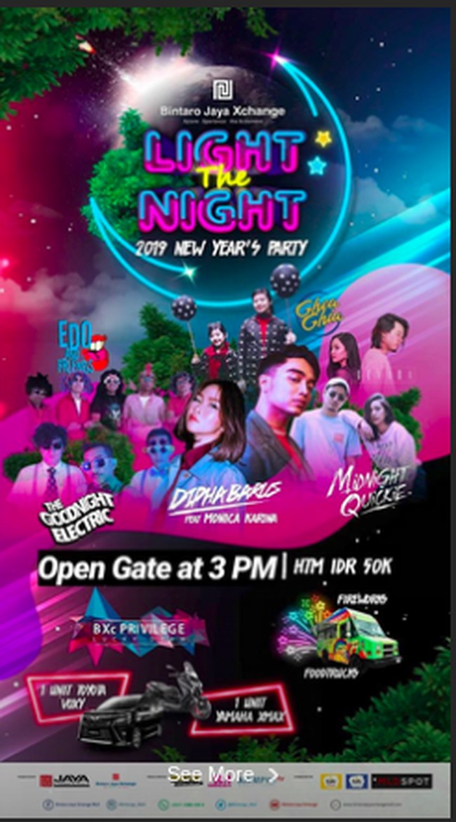 Bagaimana dengan di kawasan Tangerang? Bintaro Xchange Mall, Tangerang Selatan mengadakan acara bertema 'Light the Night'. Gelaran itu pun akan menampilkan DJ Dipha Barus, hingga Goodnight Electric, Midnight Quickie. Untuk masuk ke acara ini, Anda pun dikenai biaya Rp 50 ribu.