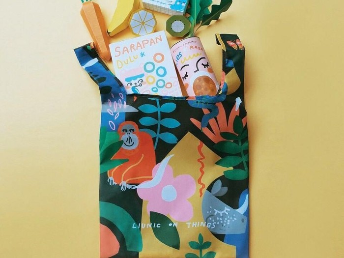 Dari Liunicon Things, Anda bisa mendapati opsi tote bag yang dengan gambar abstrak yang menarik. Party of One Totebag ini punya bentuk yang lebih persegi. Item yang dijual Rp 295 ribuan itu pun tampak punya material yang cukup tebal sehingga lebih aman untuk membawa barang lebih banyak.