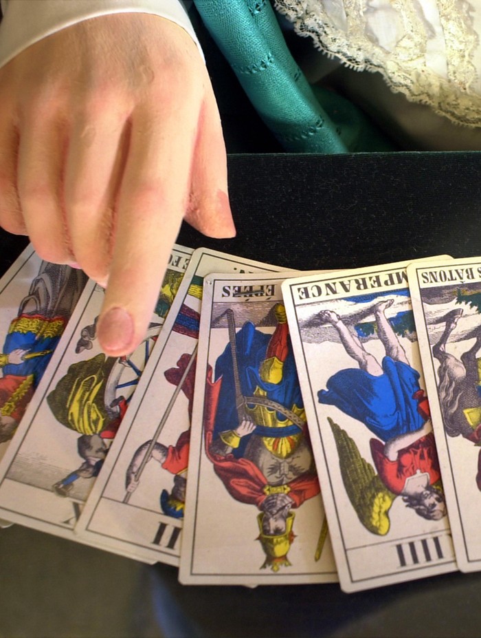 Kartu yang terbuka adalah The Chariot terbalik, Prince Wands terbalik dan Seven Coins. Tampaknya dari kartu yang terbuka ini, dia tidak seberani yang seharusnya. Ada kendala dalam hal mengekspresikan diri, dan terlihat orangnya tidak percaya diri.