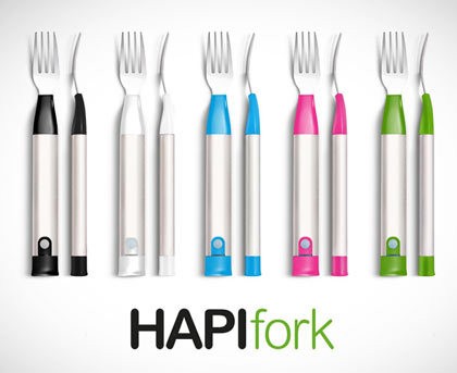 Alat ini adalah perangkat makan berbentuk garpu, yang diberi nama HAPIfork. Garpu dengan desain menarik dan berwarna-warni ini akan bergetar jika Anda terlalu cepat menyuap atau mengunyah makanan sehingga bisa makan lebih perlahan.