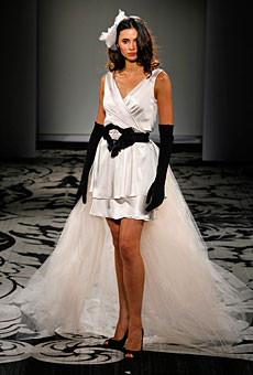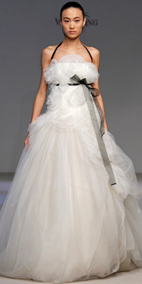 Sentuhan HitamWarna hitam tak lagi tabu untuk gaun pengantin, namun hanya sebagai elemen hias. Telah banyak desainer yang menggunakan warna hitam untuk detil gaun pengantinnya. Vera Wang misalnya, ia menggunakan pita dari bahan velvet hitam untuk detil pinggang koleksi gaun pengantin Fall/Winter 2010.