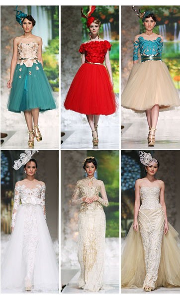 Selain itu, ia juga mengambil inspirasi dari kebaya tradisional namun dikemas secara moderen. Misalnya saja lewat gaun dengan atasan yang menggunakan brokat berkerah sabrina namun roknya dari songket berbenang emas. Atau gaun strapless dengan songket biru muda namun bertabur glitter metalik dan tambahan tulle untuk bagian belakang gaun.